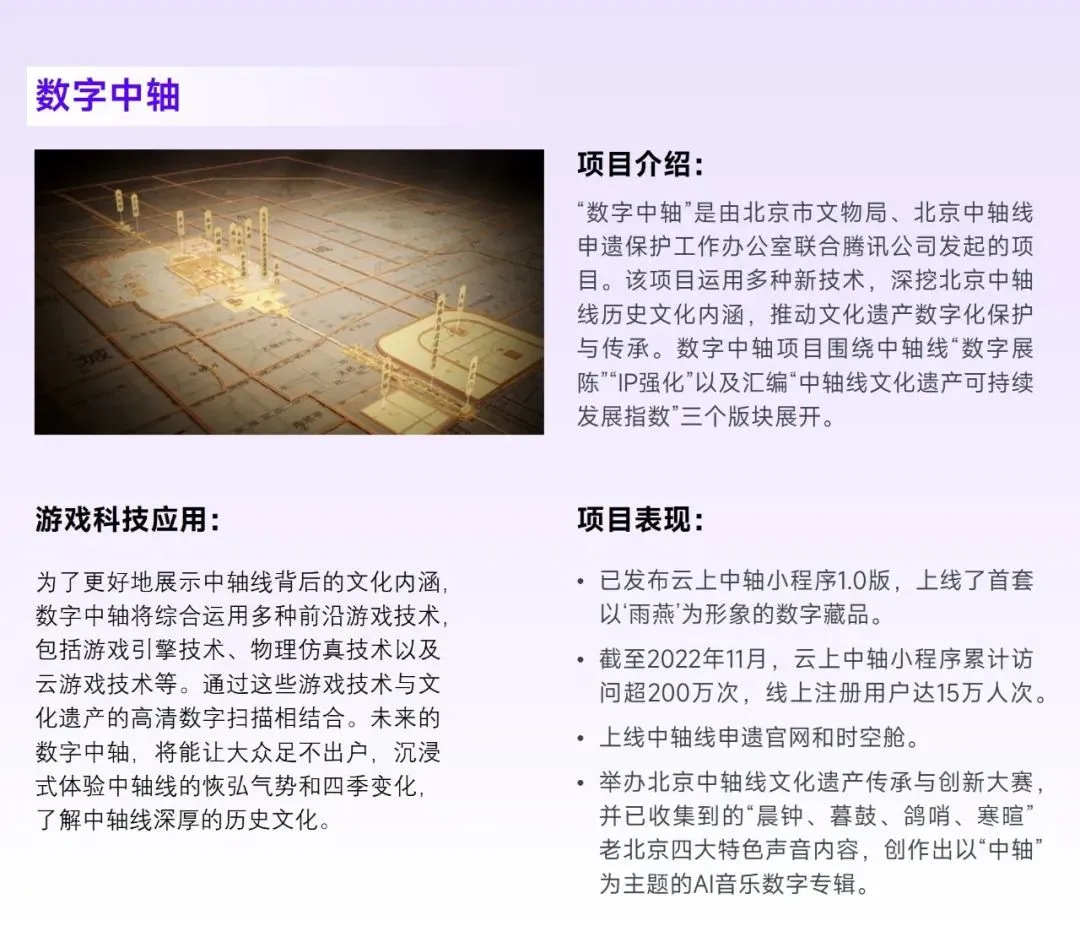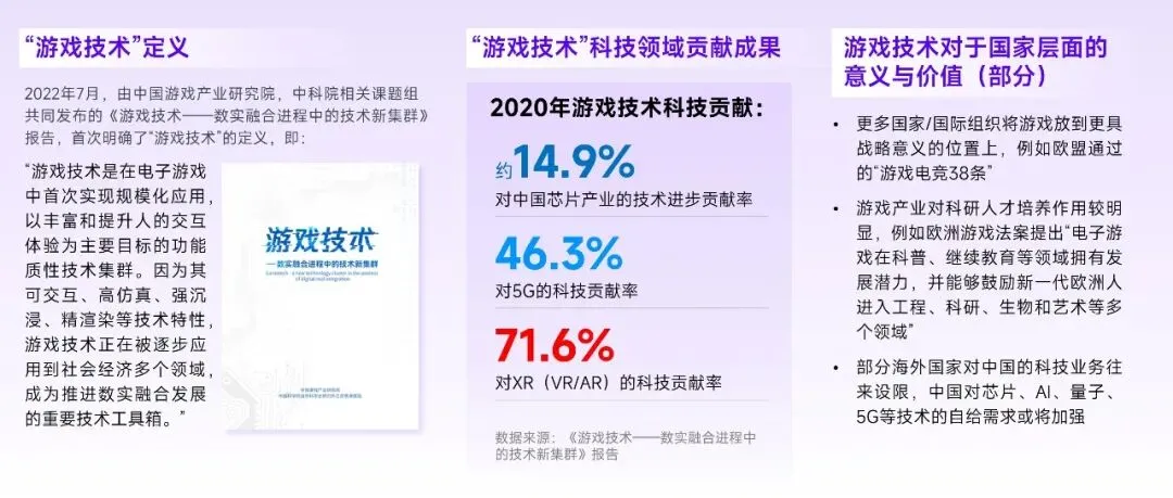 游戏产业在诞生伊始即与科学技术密切相关,且二者的关联在近年快速提升,从成果上看,游戏已成为芯片、高速通信网络、AR/VR等产业技术进步的重要贡献方。关联更密的深层原因主要在于:一方面,运用技术提升用户游戏体验的初衷并未改变,且更为迫切,更高的游戏科学技术水平有助于满足用户娱乐需求;另一方面,游戏能助力科技领域自立自强、培养科技人才,以技术和人才为媒介进而帮助游戏在更多领域取得成果,其价值也愈发得到国家层面的认可。针对于游戏科技的研究也在持续推进,2022年7月,由中国游戏产业研究院、中科院相关课题组共同发布的《游戏技术——数实融合进程中的技术新集群》报告中,明确提出“游戏技术”的定义,进而帮助游戏产业更好挖掘社会价值与经济价值。