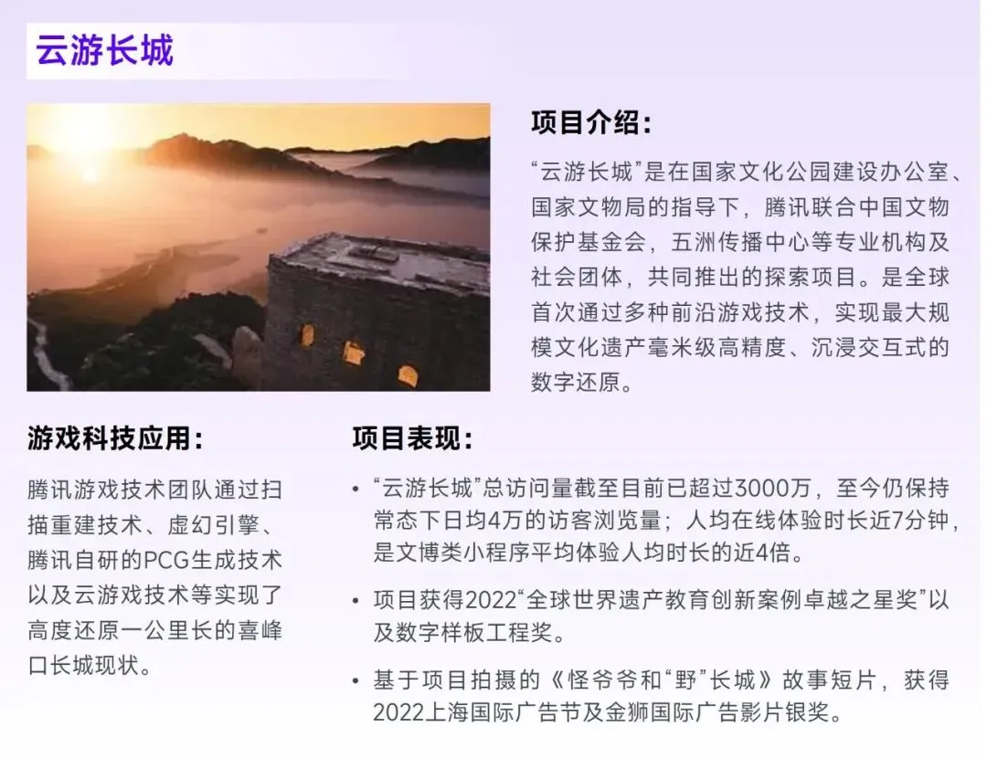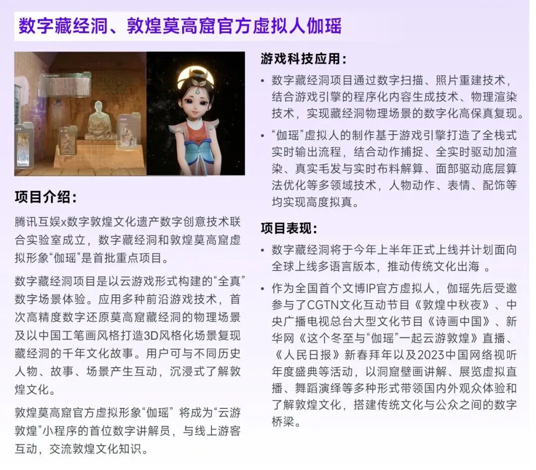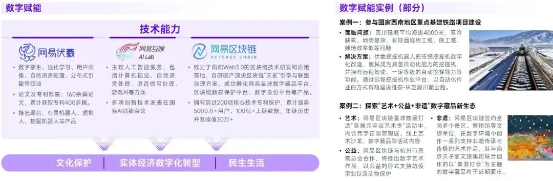 相较于世界级IP侧重网易游戏在游戏产业的潜力拓展,数字赋能则能够突破单一产业桎梏,为企业形成数十倍甚至百倍于游戏产业的潜力空间。网易游戏能够在数字赋能领域具备潜力,主要依托已有技术成果,以及网易伏羲、网易互娱AI Lab等研究机构。从现有布局来看,未来数字赋能的潜力利好或于以下几个方向产生:第一,企业有望深度参与文化保护进程,这是由于近年来文化遗产受损事件频发,并对部分遗产造成不可逆的损伤,而数字化则可以通过记录其全貌、细节的方式推动文化遗产的传承与保护;第二,参与实体经济的数字化转型,部分实体经济自身方法论的迭代已较为充分,而数字化可以从更为立体、客观的视角帮助实体寻找提升空间以及落地方法;第三,助力民生生活,数字赋能能够以较低的成本、较快的速度将其成果分发至大量社会公众,在增强公众的防范意识、提升公众教育水平等方面发挥作用。