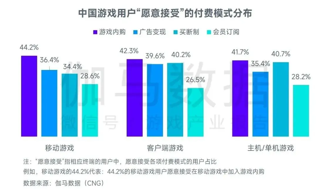混合变现:41.7%主机/单机游戏用户愿意接受内购,34.4%移动游戏用户愿意接受买断制