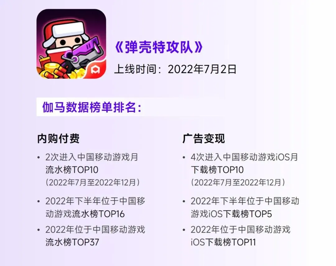 伽马数据认为混合变现有望成为产品多元化变现突破口的第二项原因在于,从长期来看相较于负面效果,混合变现的正向增益或更明显。这是由于广告模式、买断制等均依托于某些领域深入发展,被用户所熟知,例如休闲游戏推动广告变现发展、主机游戏推动买断制发展。从市场表现来看,已有以《弹壳特攻队》为代表的混合变现产品在广告、内购两项渠道中均取得较优成果,证明了混合变现的可行。