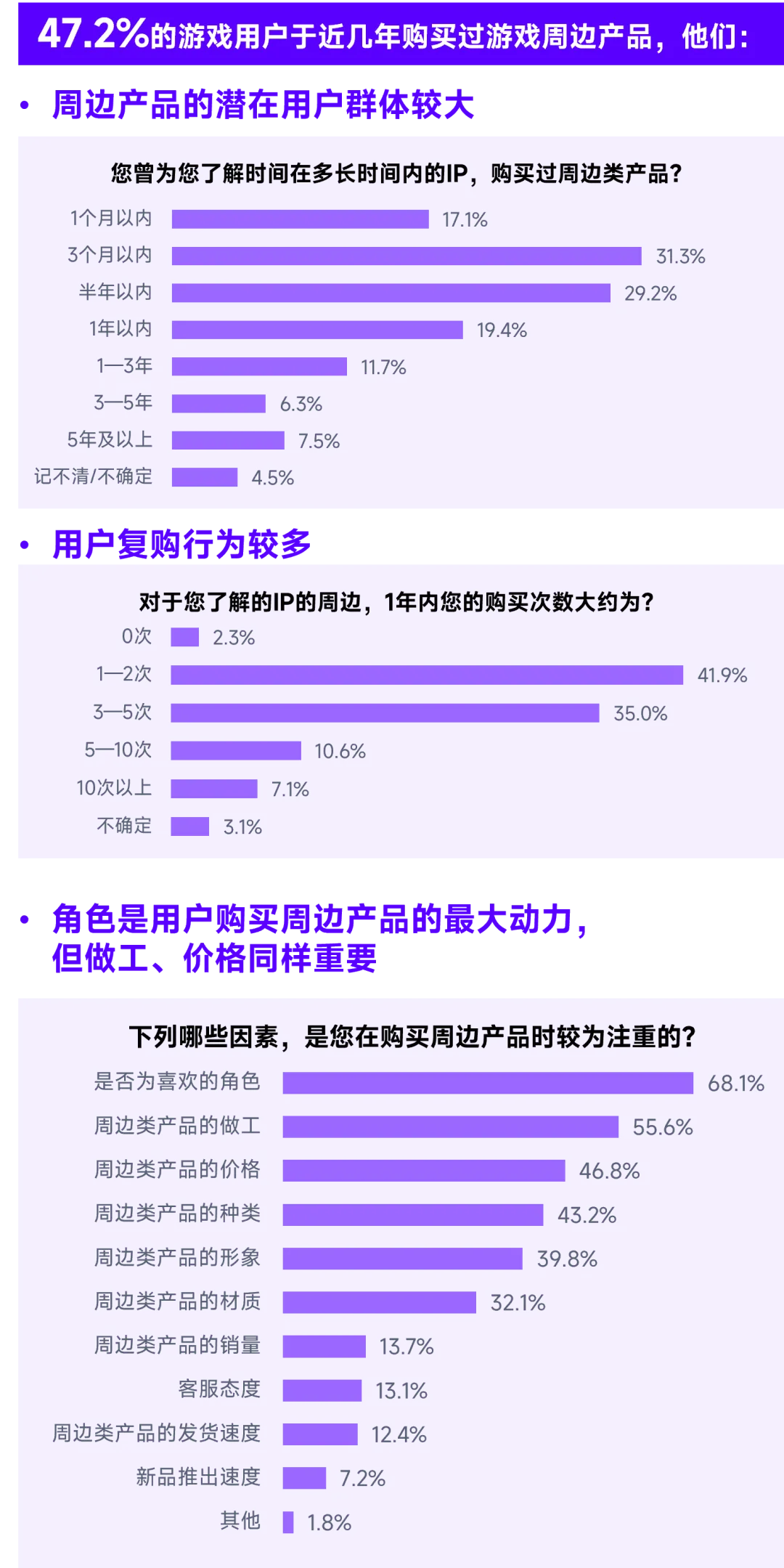产业链拓展:47.2%的用户近年购买过周边产品,其中超50%用户每年购买3次以上