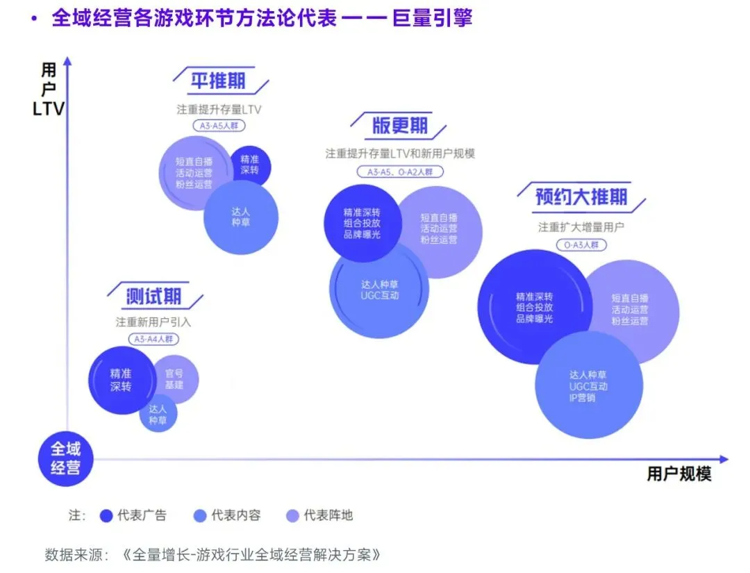 全域经营的另一运用潜力在于其适用的环节较多,例如在产品的测试、预约、上线、长线运营、用户回流等环节均可使用。这是由于上述环节均需要服务提供企业能够帮助游戏企业精准的描绘用户画像、定位用户位置、高性价比获取用户、挖掘用户潜在信息,而上述需求均可依托全域经营联通多环节、细致划分用户的营销方式特色实现。