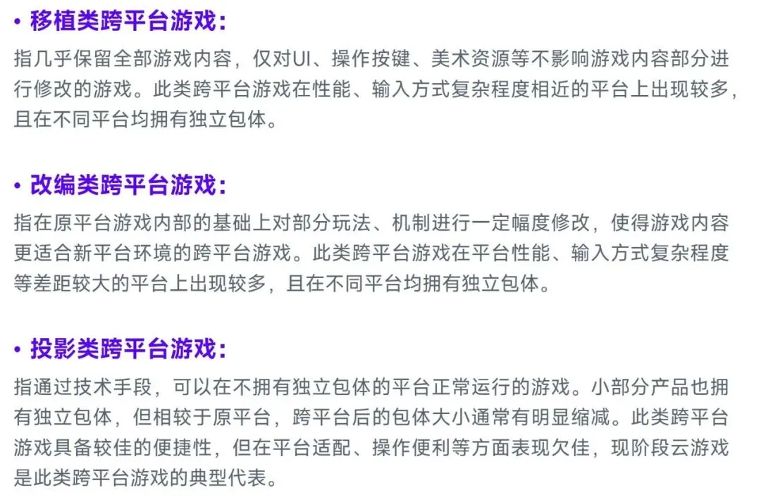 跨平台是指可以在不同平台运行的同一款游戏,吸引不同平台的游戏用户进而扩大总用户规模是跨平台游戏的核心优势。现阶段跨平台游戏主要拥有改编类跨平台游戏、移植类跨平台游戏、投影类跨平台游戏三种优劣各异的模式。