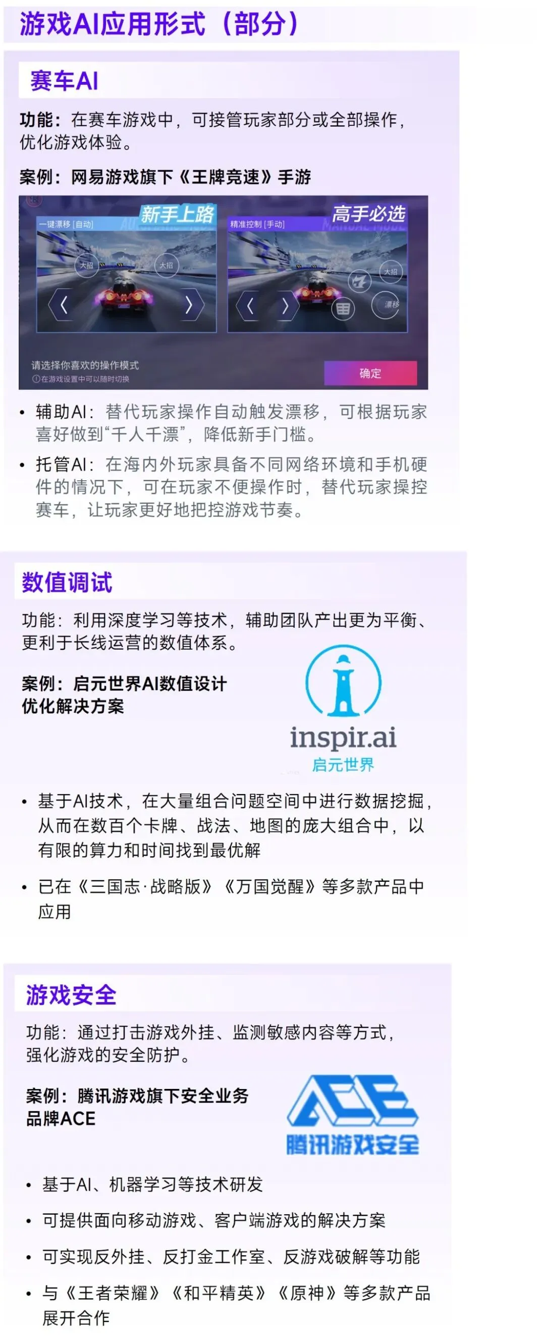 游戏AI与游戏引擎是方向不同但目的近似的科技领域游戏应用,二者相较,虽然游戏引擎更侧重于塑造游戏“形象”,而游戏AI则倾向于游戏“内涵”的升华,但二者在游戏领域的应用目的,均为实现用户对于精品化的期望。游戏AI的发展潜力主要在于普遍提升用户在游戏的过程中通过智力的博弈、情感的共鸣、沉浸的体验等获得的游戏感受。这是由于现阶段上述体验的塑造高度依赖于游戏从业者的经验与能力,使得出于人才稀缺性、试错成本等因素,难以规模化的提升产品表现。虽然发展尚不完善,但现阶段游戏AI已经可以通过学习、模拟真实人类的行为,在游戏研发、运营等阶段,以数值调试、智能NPC、提升游戏安全等级等形式,在游戏产业的重要环节投入应用。