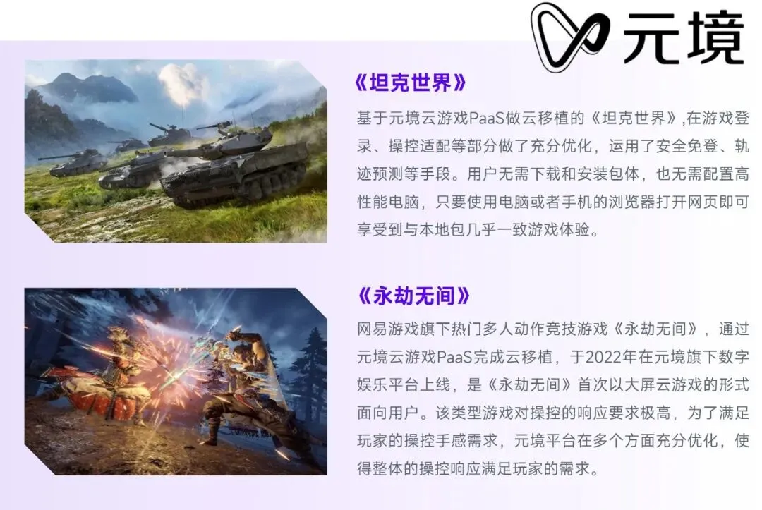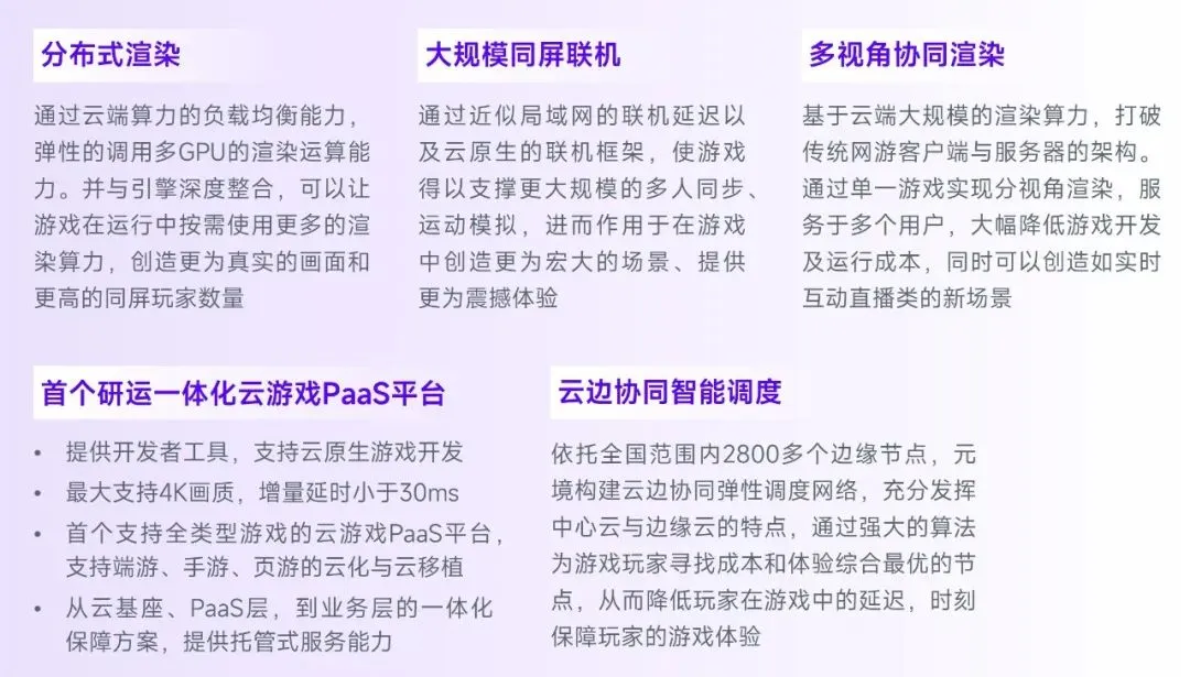潜力的第二个方向在于云原生游戏,云原生游戏是指原生于云的游戏,成熟的云原生游戏可实现CG级实时交互能力、上万用户同屏流畅运行、玩法创新等高品质游戏表现。现阶段,部分游戏企业已经尝试在内容制作阶段加入云原生相关的设计,这些游戏在上市后会更为自然的同步发布云游戏版本,为用户提供差异化游戏体验。而在影响云原生游戏产出、普及的诸多因素中,云游戏平台能否提供企业级的服务能力是重要因素之一。例如能否提供分布式渲染、支撑大规模的同屏联机、多视角协同渲染这些能力,对云游戏平台都是高难度的技术挑战。依托自主研发或与第三方企业合作提供这类服务,将成为云原生游戏规模落地的重要一环。