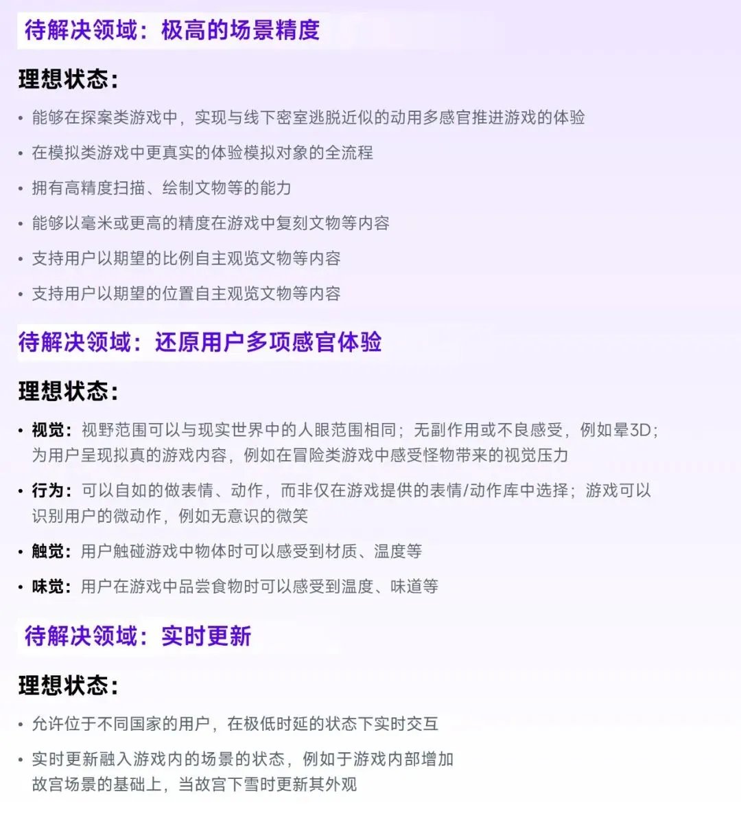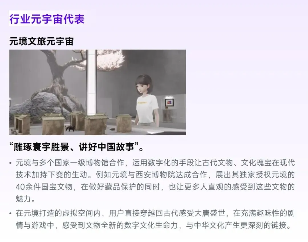“强化用户的拟真体验”将使用户在线上的参与体验无限趋近甚至超越线下,以旅游为例,相较于传统旅游方式,在元宇宙游戏中旅游或可实现在保持与线下旅游一致的听觉、触觉、嗅觉等的感受的基础上,具备随时随地、降低与同伴协调时间的难度、无需错峰出行等利好。但这部分期望的落地对技术水平提出极高要求,例如以毫米级精度还原游戏场景及用户、为用户提供多感觉的拟真体验、能够支撑海量级的数据实时传输及运算的底层能力。现阶段,以腾讯游戏、网易游戏、米哈游、元境、Unity为代表的强技术型企业是这一方向的主要布局者。