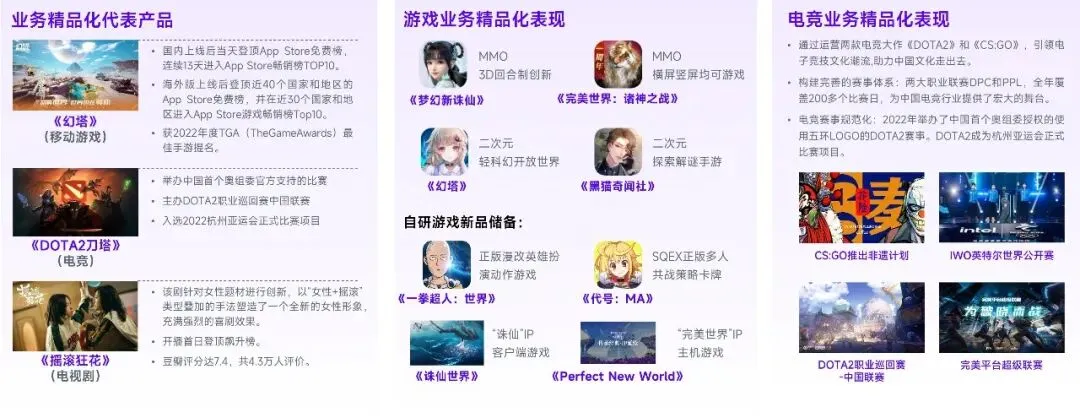 完美世界控股集团的潜力主要集中在业务精品化、新兴领域、多领域协同等方面,同时,技术能力是潜力的重要来源。经由优缺互补、巩固优势获取更为显著、健康的成长是较多企业布局领域协同的初衷。业务精品化的潜力主要体现为高品质产品的持续产出,这是由于高品质产品正处于需求转型、难度提升的过程中,用户侧重逐步由视觉、听觉等外部感官转向情感等内在体验,而完美世界控股集团较早认知并挖掘新机遇,有望借此强化高品质产品产出,现阶段代表产品有《幻塔》(游戏)、《DOTA2》(电竞)、《摇滚狂花》(影视)等。