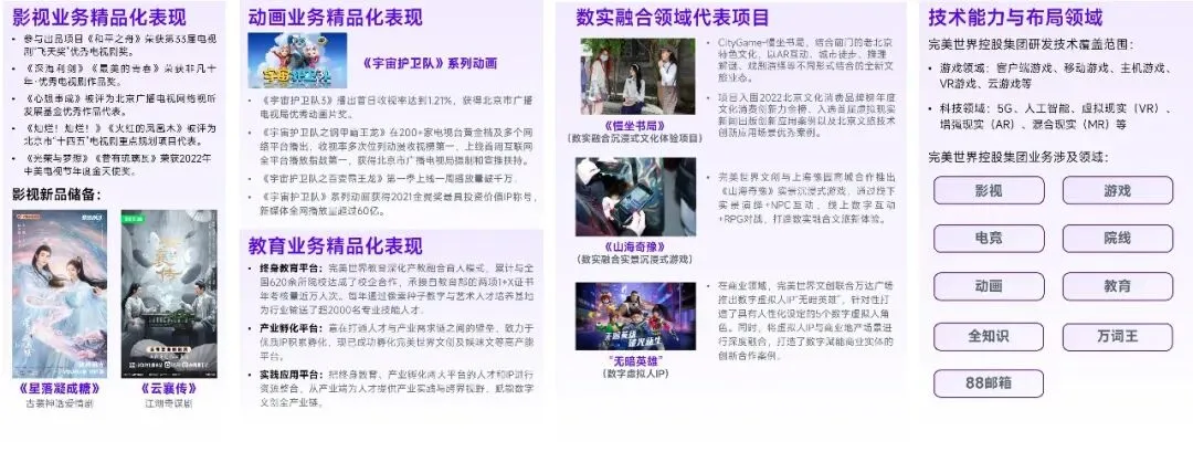 新兴领域方面,产业可重点关注完美世界控股集团在数实融合领域的拓展,数实融合具备政策环境较优、想象空间较大等背景,但也对企业能力提出较高挑战,完美世界在这一领域具备至少三项优势,第一,技术能力较强;第二,布局经验较多;第三,基于多项业务的内容属性,对用户需求把握较深。伽马数据认为完美世界控股集团具备领域协同潜力的原因在于,企业离上述目标已更为接近,例如业务的精品化表现提升明显,自造血能力更为充足,涉及游戏、影视、电竞、动画、人才培养等多领域;又如协同作用逐步由表层下沉至内核,旗下产业园可依托企业经验为入驻团队提供较深层面支持。同时,协同效应提升的原因主要在于,首先,各领域均注重长期质量而非短期变现;其次,较为关注领域发展趋势;最后,技术能力仍然起到支撑作用。