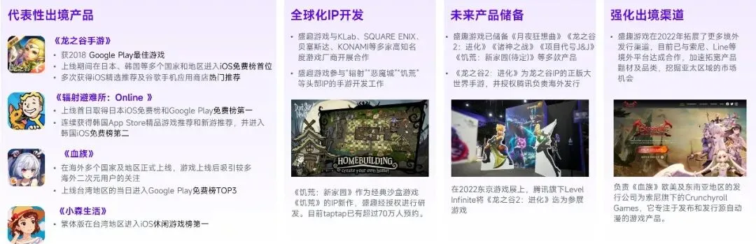 境外市场是盛趣游戏的另一潜力领域,并有望在多项细分领域呈现。这一方面由于,盛趣游戏着重加码全球化IP的布局能力,例如与KLab、SQUARE ENIX等知名企业达成合作,又如储备产品中包含《月夜狂想曲》《龙之谷2:进化》《饥荒:新家园》等多款知名IP产品,IP的全球知名度较在获客、产品生命周期等方面发挥重要作用;另一方面,受全球化IP各自定位不同的影响,基于IP开发产品的玩法、题材、受众群体等差异较大,客观上将助推企业在多个细分领域的深入渗透。此外,盛趣游戏也在持续强化自身底层能力,用以承接全球化IP产品的潜力变现,例如2022年强化境外渠道能力,与索尼、Line等平台达成合作。现阶段,盛趣游戏已依托内容开发、投资布局、渠道建设、技术积累等方面,形成了较为有力的境外市场拓展支持。