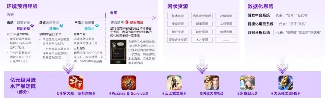 三七互娱是国内少有的能够持续产出月流水过亿元的产品的游戏企业,伽马数据认为,较高的质量和高频次的产出主要是由于三七互娱已形成动力较强、发挥较稳、转型较快的核心能力。当前,核心能力至少在环境预判经验、数据化思路、网状资源3个方向具备显著竞争壁垒。环境预判经验方向,三七互娱曾成功预判市场由网页游戏转向移动游戏、获客由粗放式转向精细化、产品由低质量转向精品化等环境变动,保障企业在各时期的竞争力,现阶段,三七互娱正围绕下一预判游戏技术转向数实融合加码布局;数据化思路方向,企业制订基于数据打造、迭代智能平台,再依托智能平台提高精品产品产出概率的思路,思路具备起步困难但成型后价值持续放大的特征,现阶段已在挖掘新细分领域等方面发挥作用;网状资源方面,三七互娱完成大量资源串联的工作,进而形成合力,最大化实现产品需求,举例而言,企业可在短时间内为产品提供大量测试机会。预计高流水产品推出能力仍将延续,企业的核心能力也将持续完善。