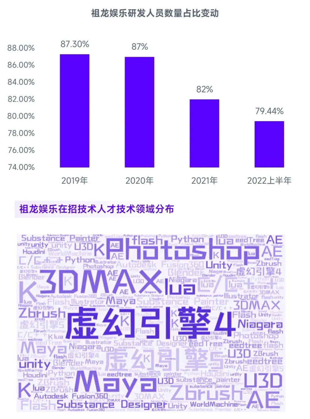 祖龙娱乐在游戏引擎、细分领域等方面具备潜力。游戏引擎是多家头部企业的重点布局对象,祖龙娱乐的优势主要在于:第一,运用经验较多,截至2023年1月底已有5款产品基于虚幻引擎4研发,数量位居产业头部;第二,升级迭代的意愿较强、速度较快,例如当虚幻引擎4仍为高质量的代表,即祖龙娱乐仍存优势时,企业已计划引入虚幻引擎5,并成为国内较早引入的游戏企业;第三,技术人才的储备较为全面、丰富,例如企业的研发人员占比多年在80%左右,又如企业寻求的技术人才分布于虚幻引擎4、渲染、Houdini等十余领域。