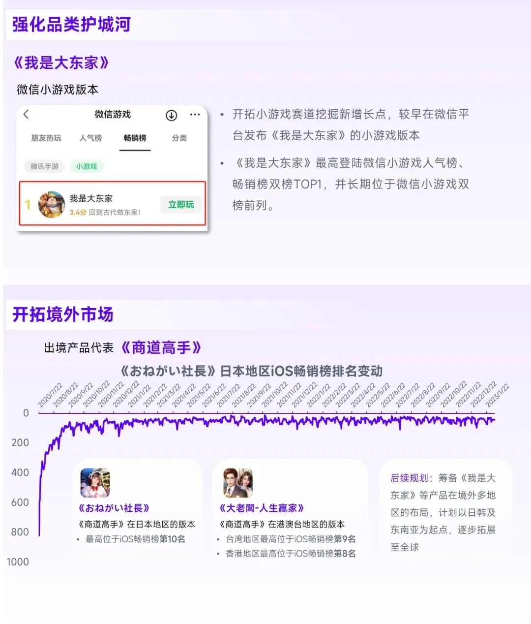 依托《商道高手》《我是大东家》等产品益世界已在模拟经商品类位于头部,未来,现有经验将在提升模拟经商品类的市场渗透率、开拓境外市场、切入其他细分领域方面,提升益世界的潜力上限。市场渗透率方面,益世界并未满足于现有成绩,而是不断强化品类护城河,例如探索小程序版本的游戏变现潜力,当益世界能够打通模拟经商品类各环节时,企业将能有的放矢的推出产品,进一步提升市场渗透率;境外市场方面,各地用户的偏好与挖掘方式存在一定共通性,这意味着益世界在国内积攒的布局经验有望较好的在境外复刻,进而实现与国内近似的市场表现,这一点已在《商道高手》中初步证实,同时,考虑到企业出境规划,境外市场的潜力释放或将提速;切入其他细分领域方面,益世界基于模拟经商品类积累的识别潜力领域、分析用户偏好、指导产品研发、实现长线运营等的能力有望应用于其他细分领域,使益世界的头部位置由模拟经商拓展至更多领域。