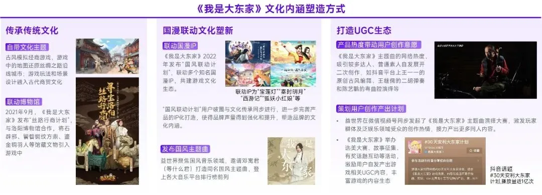 此外,益世界正在筹备更为长期更为深厚的发展潜力,即塑造游戏产品的文化内涵,当文化内涵足够丰富时,将形成以游戏为核心,拓展多项文娱领域,并实现企业、产品、用户、社会多方共赢的品牌生态。届时,对于益世界及旗下产品而言,其品牌、粉丝数量、用户粘性、收入来源均将得到极大增幅;对于用户而言,将在参与品牌生态的过程中收获娱乐、自我提升、丰富知识储备等多样价值;对于社会而言,文化遗产、民族品牌将在与游戏产品联动的过程中提升自身影响力,例如以更落地、更生动的形式被年轻用户接纳,又如随产品出海传播中华文化。现阶段,益世界主要塑造《我是大东家》的文化内涵,而当布局方式更成体系后,有望在旗下产品中大规模推广。
