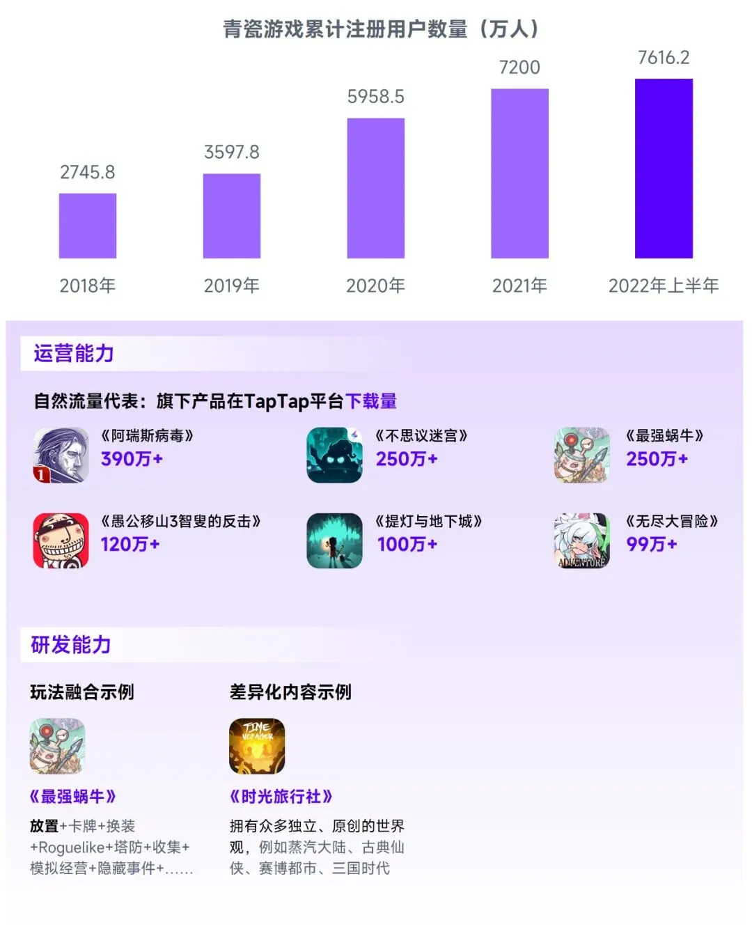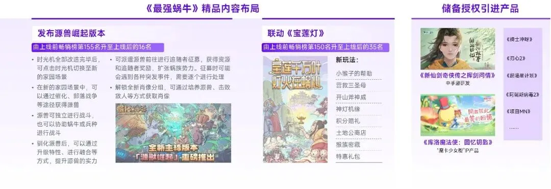 青瓷游戏的发展潜力主要体现在其研运一体能力上。在研发环节,青瓷游戏在玩法融合、差异化内容、数值体系方面拥有较强的把控能力,例如《最强蜗牛》《时光旅行社》等自研产品表现出业内少有的美术风格、世界观,以及诙谐幽默的文字风格,进而以内容创新打造差异化产品特色;在运营能力上,青瓷游戏能够根据游戏玩法特点、渠道特征及玩家自身兴趣等要素定制化每款游戏的运营活动内容,以精细化运营的方式获取了更多自然流量用户,部分用户又沉淀成为了企业粉丝,进而帮助更多产品提升获客能力,例如《使魔计划》在较少买量的情况下市场表现仍较优。