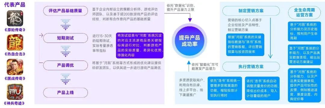 贪玩游戏在细分领域、产业链拓展等方面具备潜力。细分领域方面,贪玩游戏或将延续成功率较高的历史成果,数值相关领域更需重点关注,例如已有展现的MMORPG。数据化、智能化是较高产品成功率的保障,数据化的作用主要在于,帮助企业识别、提升产品的潜力上限,这部分主要基于能够自动生成分析标签的“河图”系统以及游戏分析团队实现;智能化的作用主要在于,尽可能多地将产品潜力变现,这部分主要基于以低误差执行原定计划的“洛书”系统及营销经验实现。换言之,经过数据化、智能化的加持企业能够以低于产业均值的风险,研运回报率高于产业均值的产品,二者空间即为贪玩游戏的长期潜力。