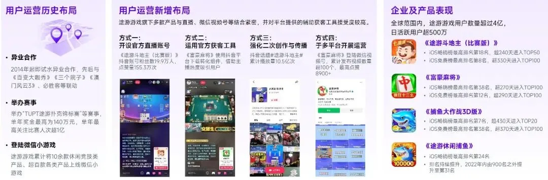 途游游戏在全域经营、细分领域等方面具备发展潜力。全域经营主要以精品化内容和多渠道布局展开,持续强化对用户的主动吸引。在经营细节上,途游总是关注市场最新的获客方式与获客渠道,早在2014年途游便尝试异业合作,与多个品牌联动获取用户。2015年途游又充分发挥旗下产品的休闲竞技特点,举办了多场休闲竞技赛事。2018年在微信小游戏发展早期便登陆多款途游产品,进而更好获取新兴渠道流量。随着短视频娱乐的快速发展,途游又借助抖音这一平台进一步强化内容营销能力,通过官方互动、内容二创等形式进行游戏内容推广并带动更多泛用户对产品的关注,同时培养更多主播推动游戏外次生内容传播。获客渠道与获客方式的持续探索也在持续强化途游的发行能力,并形成了体系化的全域经营模式,这也成为其产品维持生命周期的重要原因。同时,也有助于途游将用户获取及运营思路拓展至其他领域,例如卡牌品类,进而开辟新的赛道,这也成为途游在更多细分领域具备潜力的主要原因。