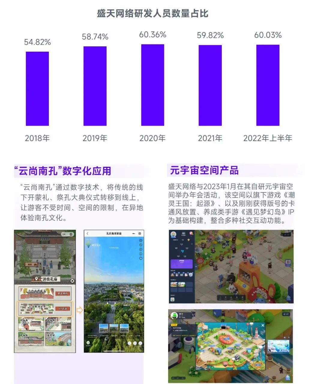 依托游戏相关技术,服务更多产业、企业是盛天网络的另一潜力领域,前者可为盛天网络带来远高于游戏产业的潜力前景,后者则可以反哺盛天网络的产业地位及技术水平。现阶段,从技术重视程度来看,盛天网络的研发人员数量长期保持在50%以上,重视程度较高;从技术储备来看,盛天网络在AR、大数据技术、云计算等多项技术有所布局,较为丰富;从内容上看,盛天网络IP业务持续增长、新投入发行业务亦取得一定成绩,IP、内容引入速度加快;从布局进程来看,盛天网络参与开发“云尚南孔”数字化应用,试水游戏与文旅产业的结合,同时自研元宇宙互动空间,可进行线上大型品牌直播、互动活动。拥有多个经典IP,并有场景赋能、内容营销与SaaS化服务能力的盛天网络,有望在元宇宙与社交赛道大展拳脚。