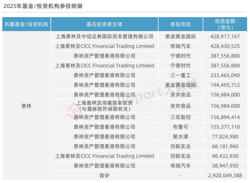 景林及富国基金均参投14次,分别合计投资金额约为29.20亿及6.96亿港元;