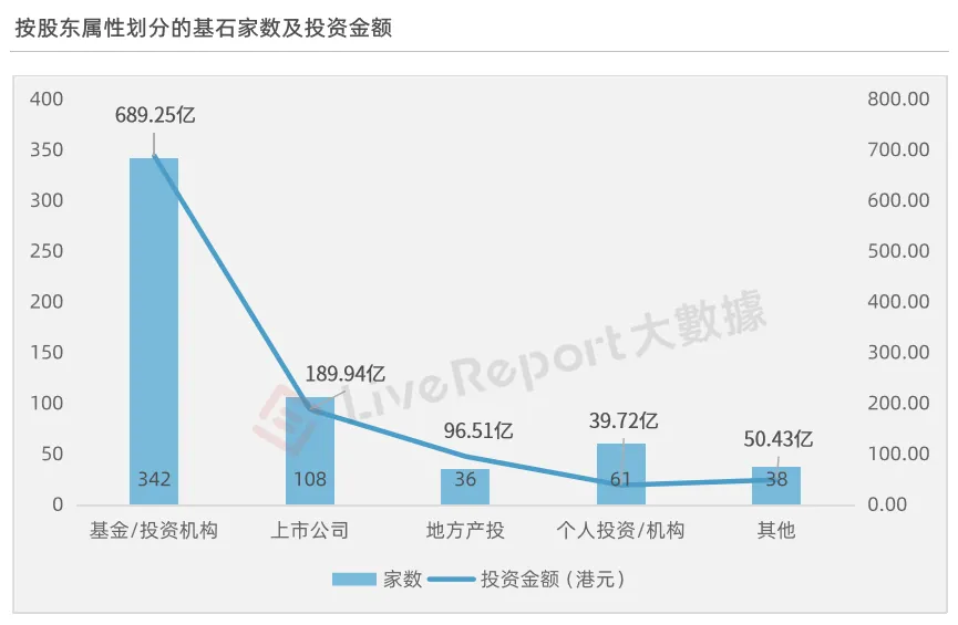其中基金/投资机构的数量及投资金额最多,共计342家,占总家数的58.46%,合计投资金额约为689.25亿港元;