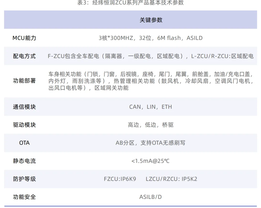 经纬恒润 ZCU 系列产品已针对不同区域位置进行了优化设计,其主要技术参数如下表所示: