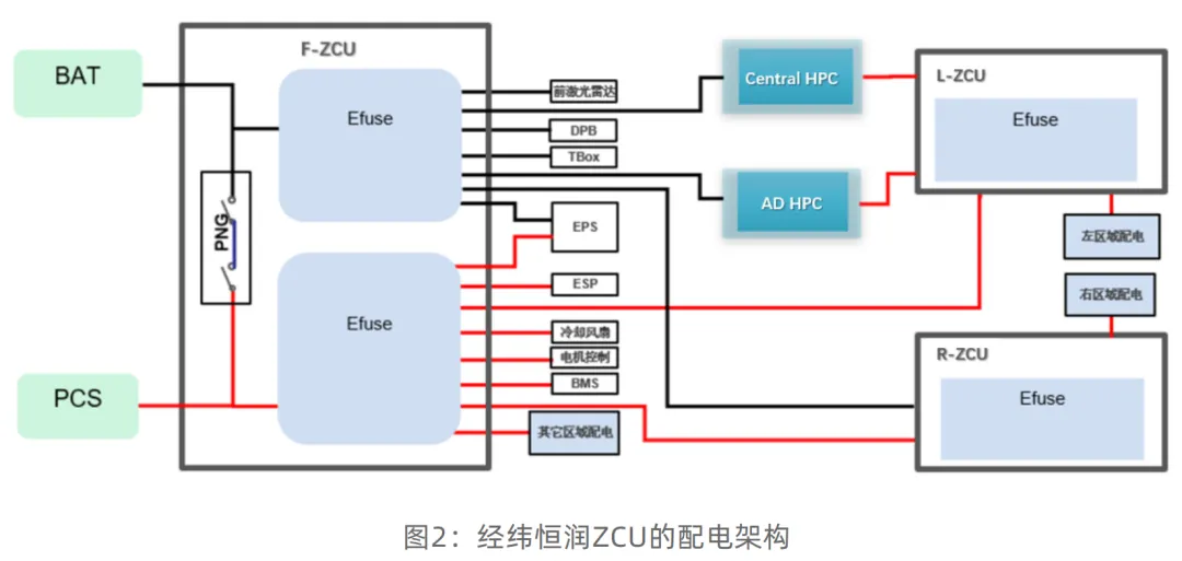 包括:两级配电管理:同时支持一级配电 (从电池直接取电) 和二级配电 (通过其他控制器取电),优化整车的电力分配架构。电子保险丝功能:替代全车所有传统机械保险丝,支持软件可配置的过流、过压、过温保护策略,保护参数可通过 OTA 动态调整。智能功耗管理:实时监测各通道的负载电流,支持休眠唤醒管理,显著降低静态功耗,提升电动汽车续航里程。故障诊断与记录:提供精确到每个输出通道的故障诊断能力,记录故障历史数据,便于售后维修和故障分析 ZCU 的智能配电,由半导体取代了传统熔断熔丝,以实现智能熔断。