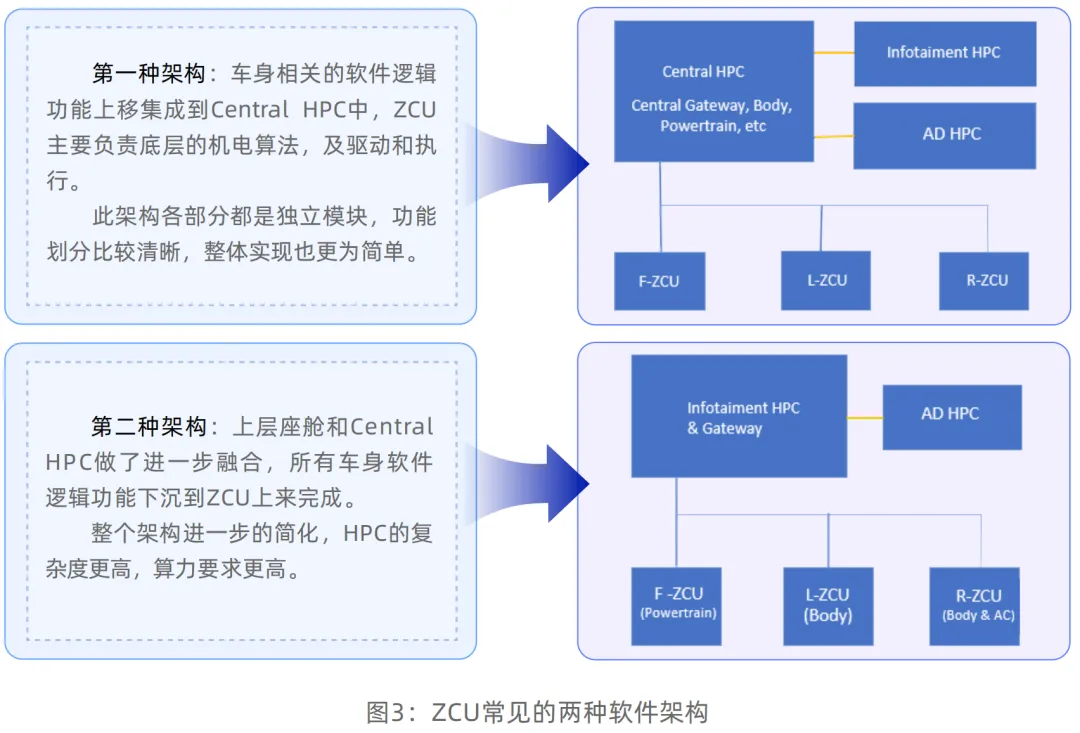 经纬恒润的 ZCU 支持如下两种软件架构:第一种架构:车身相关的软件逻辑功能上移集成到 Central HPC 中,ZCU 主要负责底层的机电算法,及驱动和执行。此架构各部分都是独立模块,功能划分比较清晰,整体实现也更为简单。第二种架构:上层座舱和 Central HPC 做了进一步融合,所有车身软件逻辑功能下沉到 ZCU 上来完成。整个架构进一步的简化,HPC 的复杂度更高,算力要求更高。