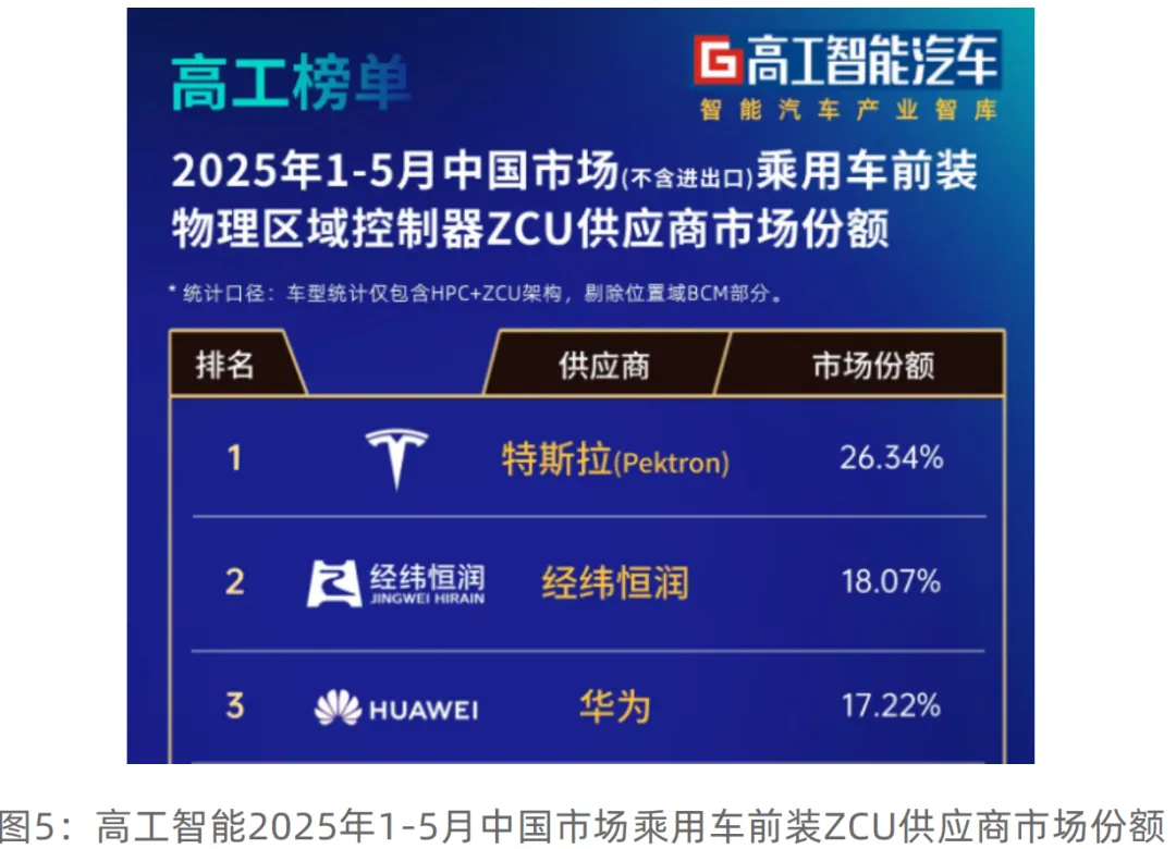 高工智能 2025 年 1-5 月中国市场(不含进出口)乘用车前装物理区域控制器 ZCU 供应商市场份额(统计口径:车型统计仅包含 HPC+ZCU 架构,剔除位置域 BCM 部分):