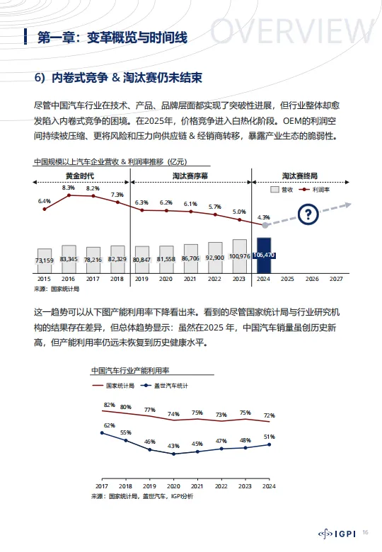 与早期以“规模扩张”为特征的线性增长不同,2020–2025间中国汽车产业所经历的是一段活力与动荡并存的结构性重构。一方面,产业政策、动力系统变革与智能化/软件化的快速推进,以史无前例的速度重塑供应链、商业模式与消费者认知;另一方面,内卷式竞争在2025年达到顶点,行业整体利润率降至历史低位。