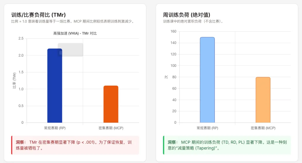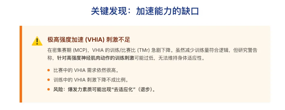 关键发现:在密集赛期,**超高强度加速(VHIA)**的训练刺激可能不足。研究指出,在MCP期间,VHIA的TMr值下降,提示体能教练需要在非比赛日(如MD-3或MD-4)进行补偿性的高强度加速刺激,以防止球员对极高强度动作的适应性衰退。