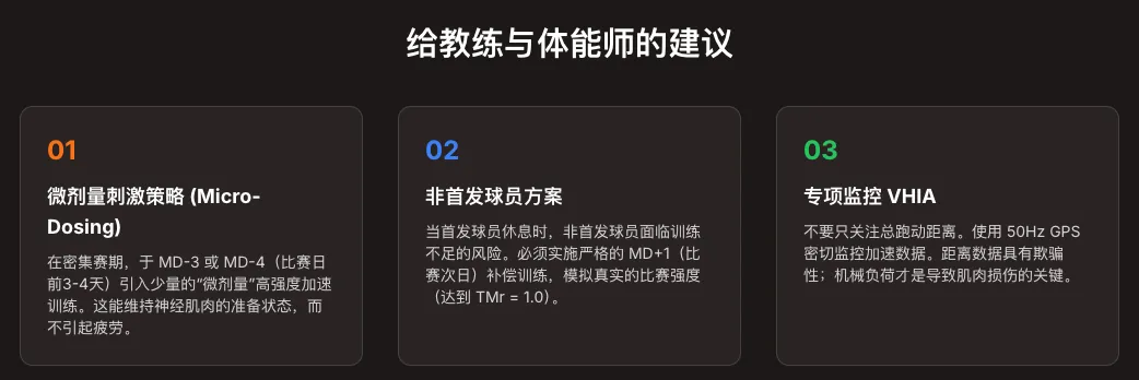 VHIA(高强加速)的微剂量刺激策略:研究发现密集赛期 VHIA 训练刺激不足。在赛程密集导致无法进行大负荷训练的情况下,如何利用“微剂量”(Micro-dosing)训练法——例如在热身环节加入极少量的最大强度起动——来维持神经肌肉的适应性,同时又不造成额外疲劳?