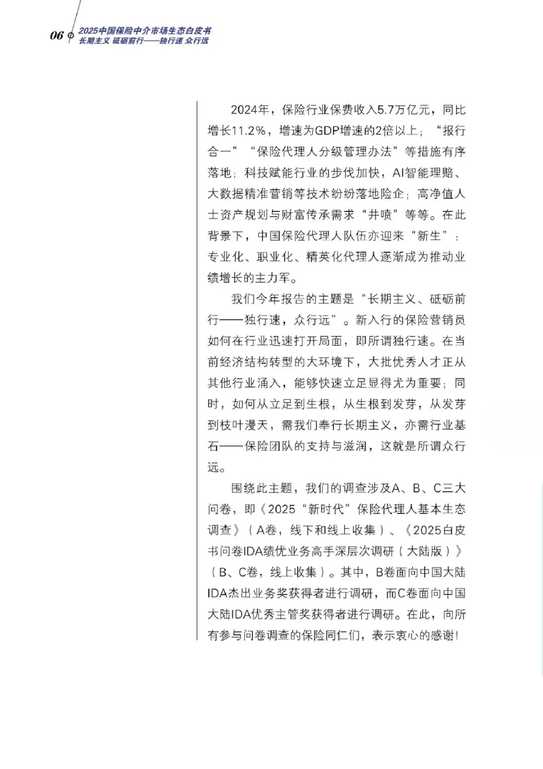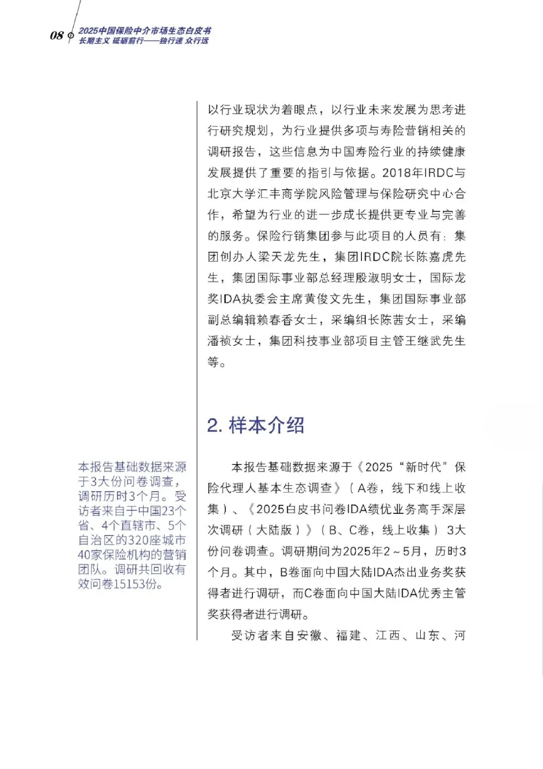 本次白皮书以“长期主义、砥砺前行——独行速,众行远”为主题,通过覆盖全国23个省、4个直辖市、5个自治区320座城市40家保险机构的15,153份有效问卷,深入剖析行业生态。