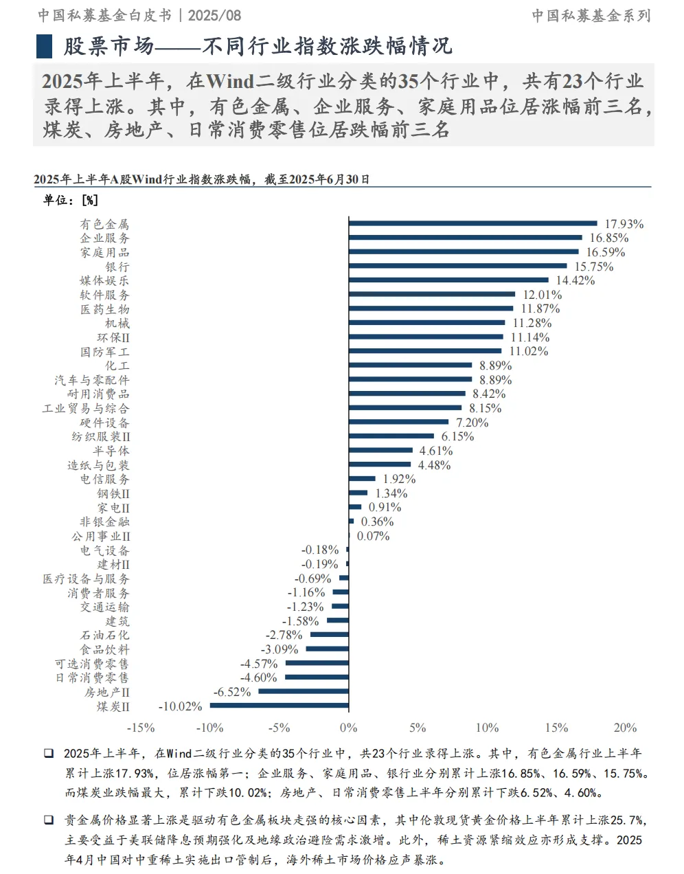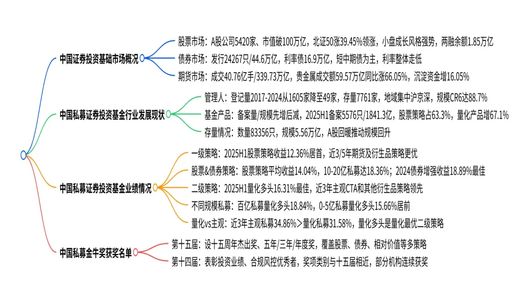2025年上半年受地缘冲突、美国关税政策等影响,全球股市整体上涨,A股呈N型走势、港股表现更强、美股V型反转,债券市场发行活跃且短中期债占主导,期货市场贵金属板块领涨;中国私募证券投资基金行业经历强监管下的洗牌,管理人登记数量大幅下降且高度集中于沪京深等区域,CR6达88.7%,2025年上半年私募产品备案量和规模同比显著增长,股票策略成主流;业绩方面股票量化多头策略上半年收益16.31%表现最佳,近3年期货及衍生品策略更具优势,中小型私募在股票策略中收益表现亮眼,主观私募近3年收益均值略超量化私募,同时白皮书还公布了第十四、十五届私募金牛奖获奖名单,覆盖多策略领域的优秀管理人及投资经理。二、内容体系