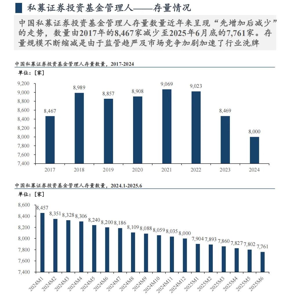(1)登记数量:2017-2024年管理人登记通过数量从1605家降至49家,2025H1登记25家(同比+4家),核心原因是监管政策收紧、行业竞争加剧。(2)存量数量:截至2025年6月末,管理人存量7761家,较2017年的8467家持续缩减,系“扶优限劣”政策清退不达标机构所致。(3)地域分布:高度集中于经济发达区域,管理规模前六大辖区为沪、京、深、浙(不含宁波)、粤(不含深圳)、宁波,CR6达88.7%,上海管理规模26010.95亿元居首。2.基金产品发展