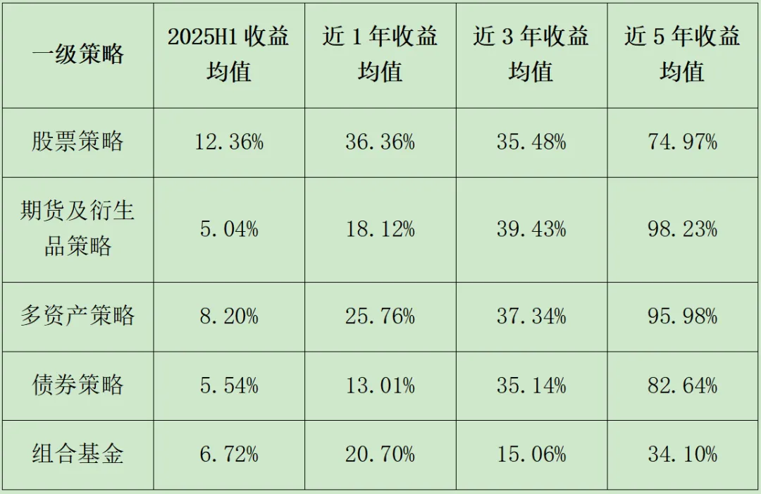 2025H1符合排名规则的4206只产品平均收益10.08%,股票策略收益均值12.36%居首,近1年收益也以36.36%领先;近3年(39.43%)、近5年(98.23%)期货及衍生品策略表现最优。2.股票与债券策略细分业绩