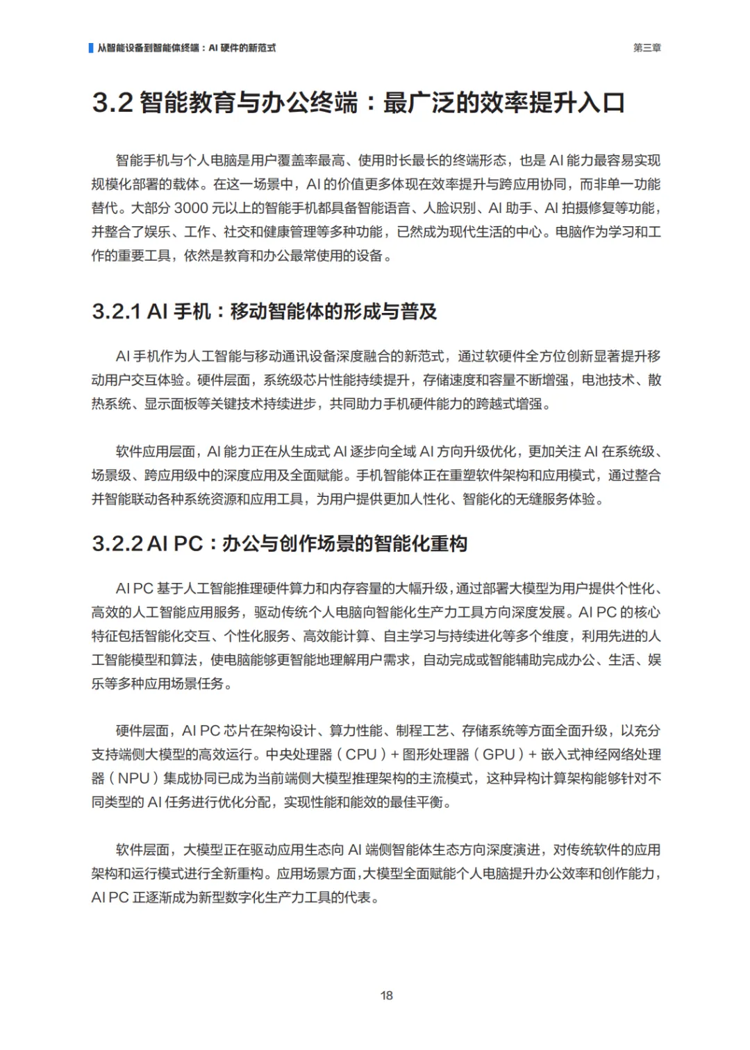 人类历史上,每一次计算范式的转变,都会重塑人机关系的边界。个人电脑将计算能力从机房带到桌面,智能手机将互联网装入口袋,云计算则使算力成为可按需获取的公共资源。而当下正在发生的 AI 能力向终端的加速下沉,代表着一种更为根本的变化 :AI 不再只是外部工具的叠加,而是深度融入产品的核心逻辑,使终端设备从被动执行指令的工具,逐步演化为能够理解需求、主动响应的智能体终端。