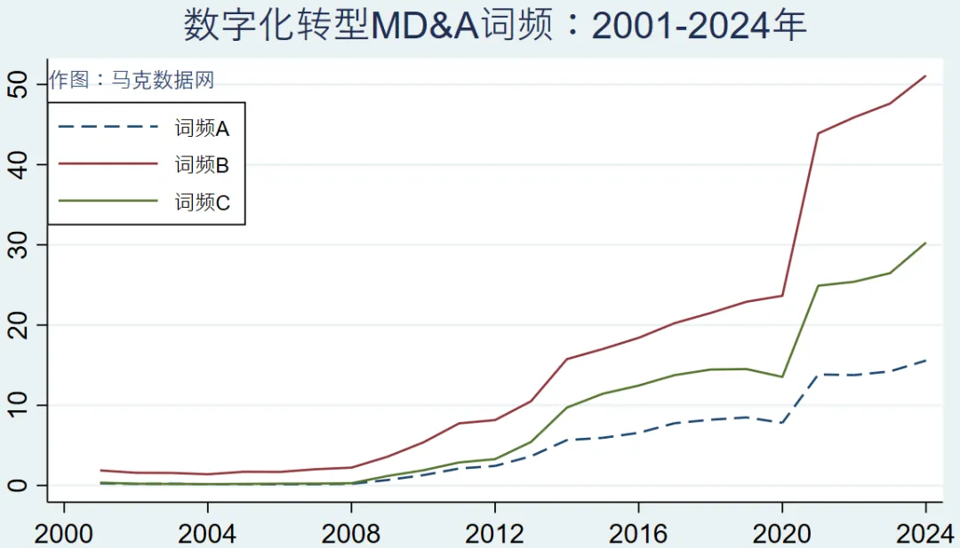 在前文,团队利用上市公司年报,对“数字化转型”相关词频进行了统计。在本期附赠数据中,进一步对MD&A文本进行统计