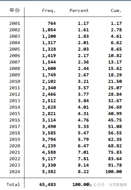 获取2001-2024年上市公司年报 将MD&A报告文本整理为面板数据 统计年报全文的文本长度 统计全文中,中英文部分的文本长度 构建数字化术语词典,将词汇扩充到python的jieba库 去除停顿词,统计精确词汇数目 计算数字化转型词频和、各维度水平词频和 计算3种方式下的数字化转型水平