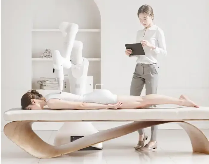 #易启未来理疗机器人 清晰地描绘了未来理疗室的图景:那里没有冰冷的机械,只有懂得协作、善于倾听、精准服务的智能体;那里不仅是缓解疼痛的场所,更是融合了科技美学与人性关怀的沉浸式健康空间。