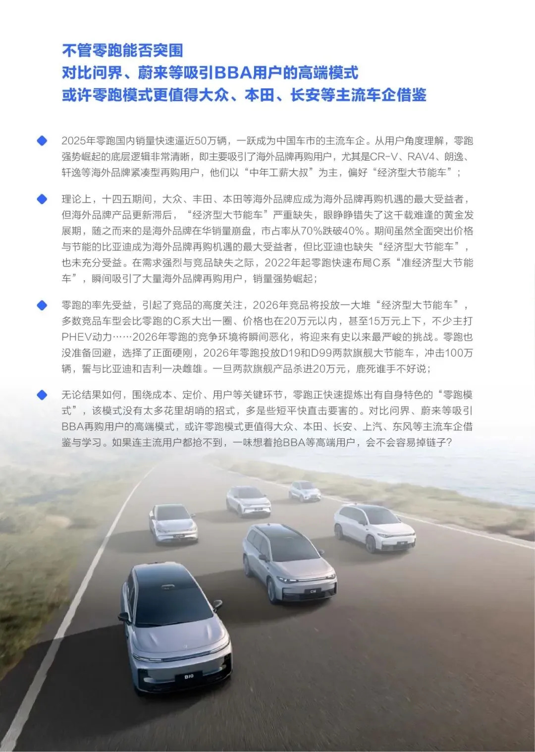 面对2026年的挑战,零跑选择正面迎战,计划通过D19、D99等新车型冲击百万销量目标,与比亚迪、吉利等展开直接竞争。其发展路径为传统主流车企提供了重要借鉴:相较于高端化路线,深入理解基盘用户的真实需求,并快速提供适配产品,同样是实现增长的有效路径。