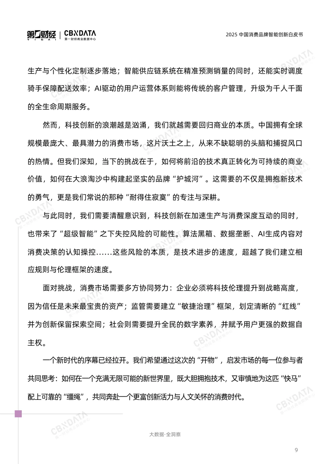 2025年,全球科技革命持续推动产业格局重塑,消费行业正从规模扩张转向高质量发展。中国正处于“十四五”收官与“十五五”启动的关键阶段,经济增长动能转换和扩大内需战略不断深化,人工智能等技术的应用被提升至国家战略高度。当前消费市场进入存量竞争阶段,同质化与利润压缩带来严峻挑战,但科技创新也为领先企业提供了突破机会。AI技术正深度渗透到消费行业的各个环节,从产品研发、智能制造到精准营销,带来效率提升与体验升级。例如,AI与生物技术结合优化材料研发,AI与机器人协同提升供应链效率,生成式AI重构营销方式,使品牌与用户互动更加高效和个性化。越来越多消费企业积极布局科技,通过并购、开放式创新及与科技企业合作等方式,加速自身能力重构。这种变革不仅是技术应用的延伸,更是企业生存与发展的必然选择。“开物成务”的理念在新时代被重新诠释,强调通过科技创新实现产品与服务的进化,回应消费者需求的变化,探索传统品类升级与智能新品类爆发的趋势机遇。这不仅是一次对行业技术进展的总结,更是一次对未来生产与生活方式的理性思考。