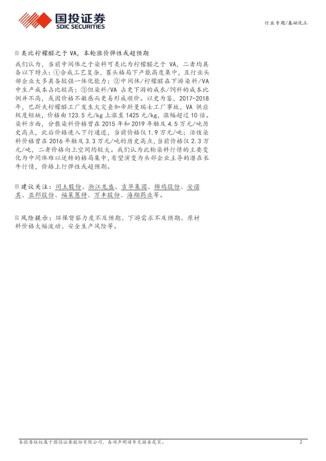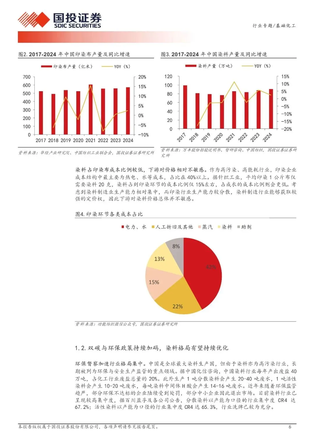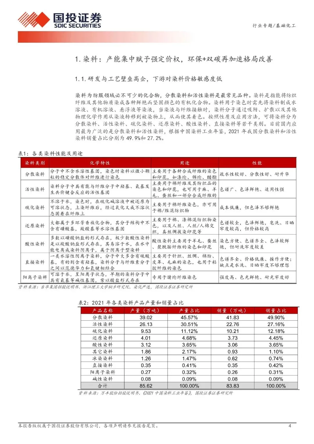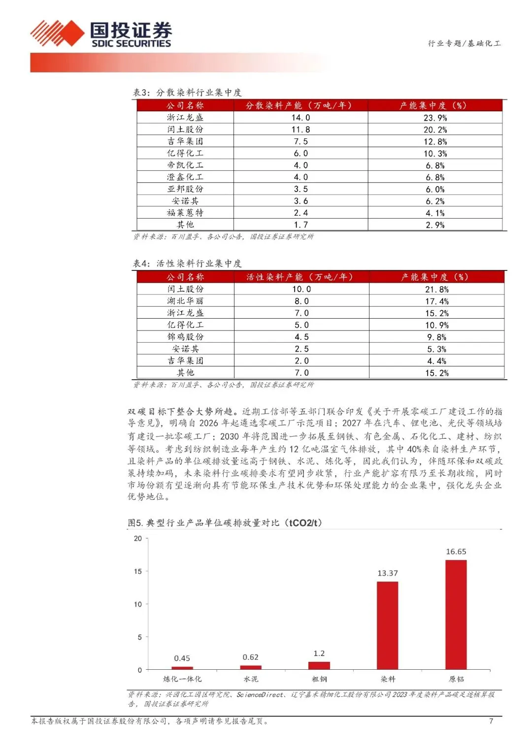 目前染料行业已呈现较高集中度,据百川盈孚及各公司公告,分散染料以产能为口径的行业集中度 CR4 达 67.2%;活性染料以产能为口径的行业集中度 CR4 达 65.3%,行业洗牌已较为充分。此外近期工信部等五部门联合印发《关于开展零碳工厂建设工作的指导意见》,2030 年零碳工厂将范围进一步拓展至钢铁、有色金属、石化化工、建材、纺织等领域。其中印染作为纺织业关键一环,碳排要求有望同步收紧。我们认为,伴随环保和双碳政策持续加码,行业产能扩容有限乃至进一步出清,毋需担忧潜在产能冲击。