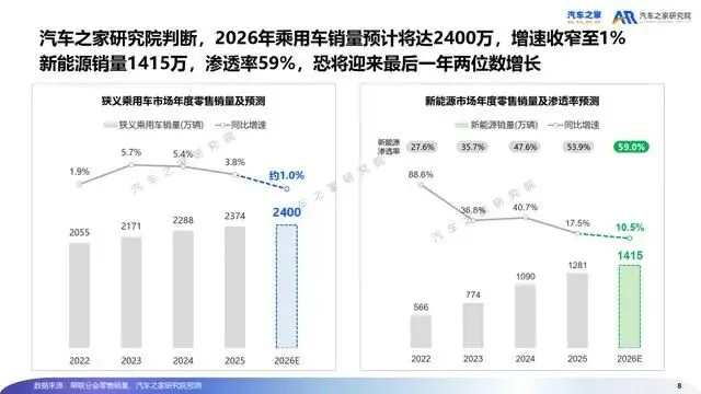 乘用车销量预计达 2400 万辆,增速收窄至 1%;新能源销量预计 1415 万辆,渗透率 59%,或将迎来最后一年两位数增长。新能源结构分化加剧,纯电持续稳健增长,插混 & 增程受政策门槛提升、供给收缩影响,进入存量调整期。