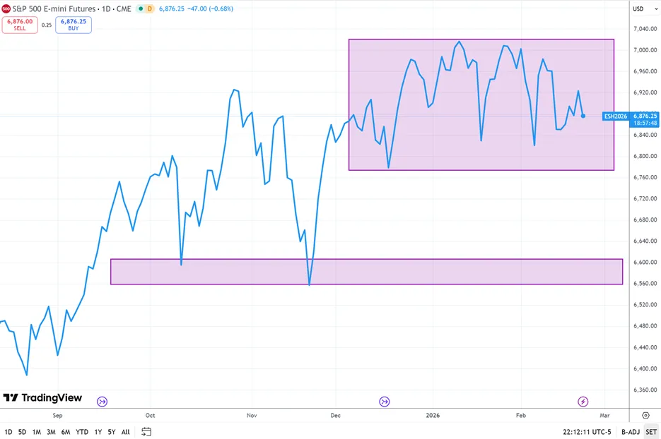 从去年十月到现在,涨两天,跌两天,涨四天,跌回来。标普500在6600到7000之间反复磨,磨了快五个月。