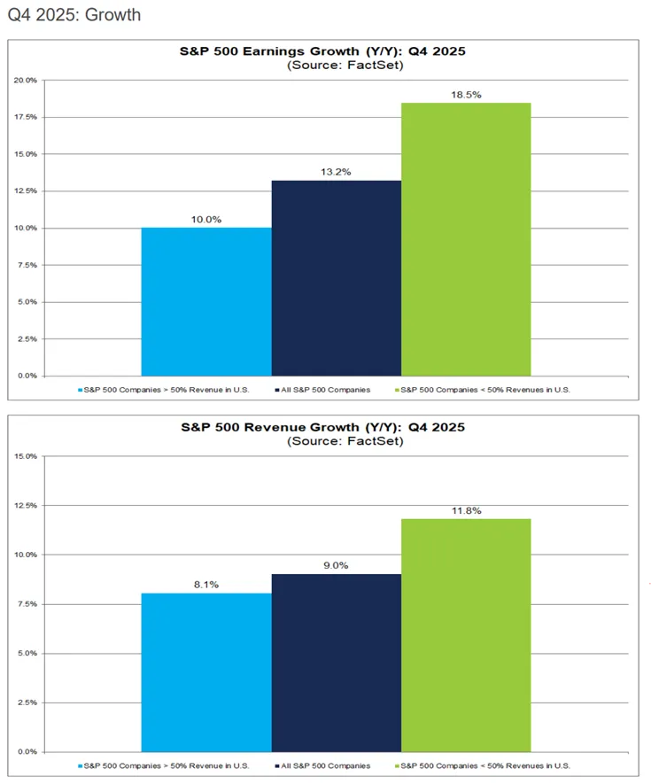 FactSet截至2月13日的数据显示,Q4 2025标普成分股的混合盈利同比增长13.2%,远超财报季初8.3%的预期。据FactSet口径,这是连续第五个季度双位数增长。营收增长9.0%,创2022年Q3以来最强。分析师对2026全年的盈利增速在14-15%之间。