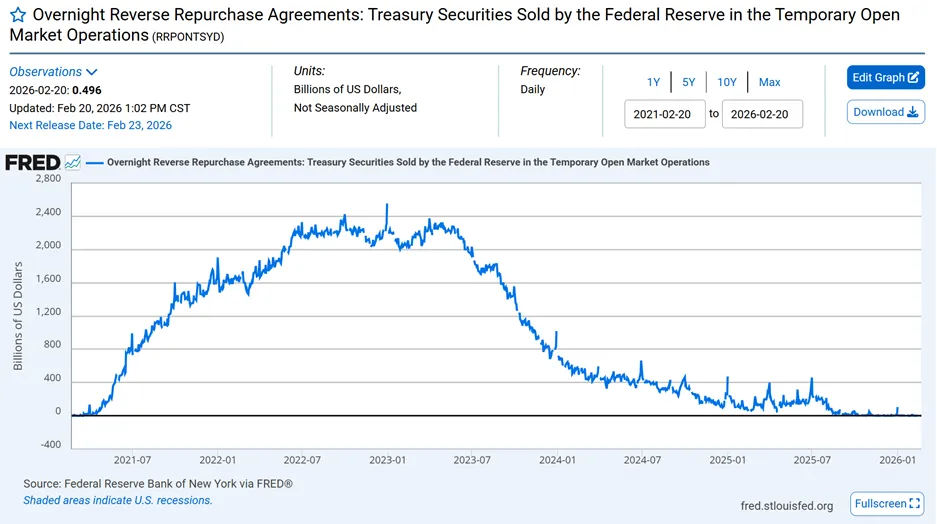 ON RRP余额2月20日仅剩约5亿美元,较2023年峰值2.5万亿几乎归零。但这并没有引发任何短端利率异常。