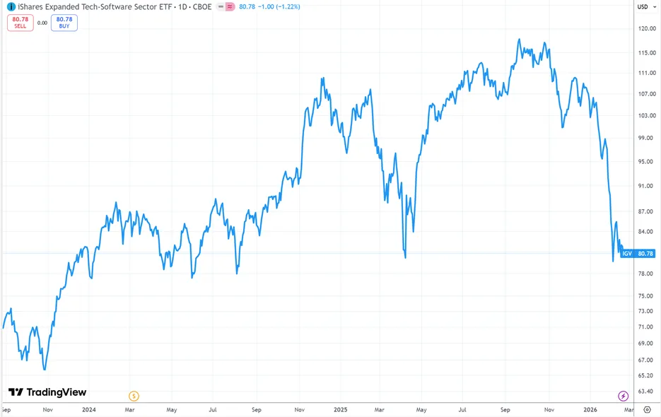 IGV从2025年9月高点暴跌逾30%,2026年1月单月跌14.5%(2008年10月以来最差),2月5日录得约54亿美元单日已实现亏损,这是典型的投降式抛售。远期PE从35倍压缩到约20倍。AI Agent对SaaS"按席位收费"模式的威胁是真实的
