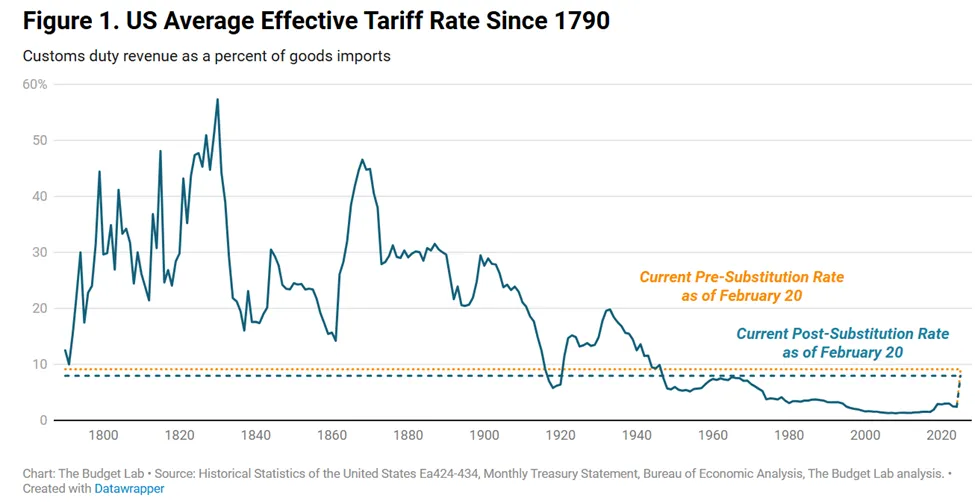 耶鲁预算实验室2月21日修正后的数据显示,最高法院裁决将实际有效关税率从16.0%降至约9%。据Penn Wharton Budget Model测算,裁决涉及的已征IEEPA关税退还金额高达1750亿美元,反而形成短期正向财政脉冲。关税恐慌驱动深度回调的路径,基本封闭了。