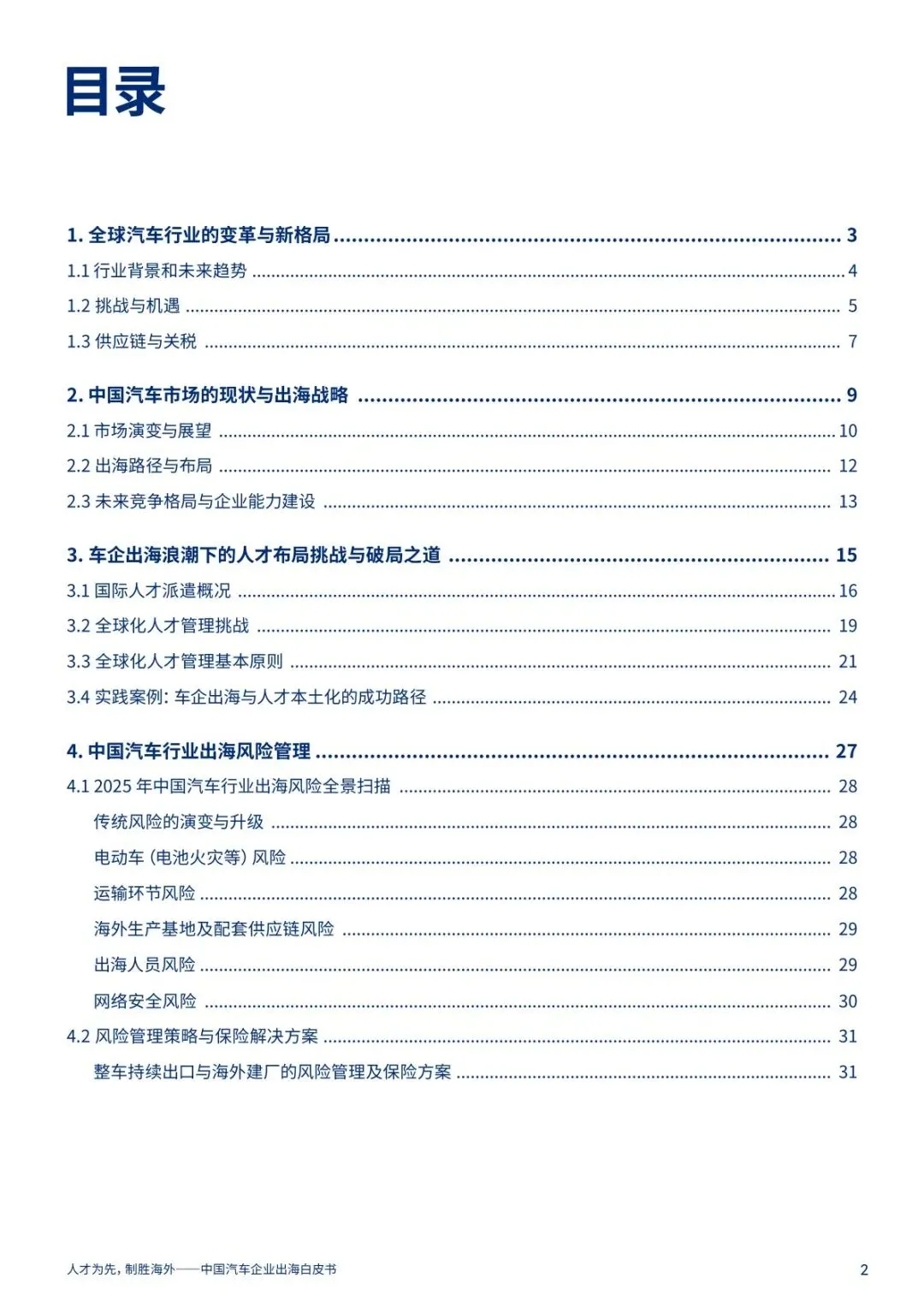 该白皮书聚焦全球汽车行业变革背景下中国车企出海的战略、人才与风险三大核心议题,分析行业从 “产品出海” 向 “生态出海” 转型的趋势,梳理车企出海路径与布局特点,剖析全球化人才管理的挑战与破局之道,扫描地缘政治、供应链、网络安全等多重风险,提供针对性风险管理策略与保险解决方案,为车企海外可持续发展提供实操指引。