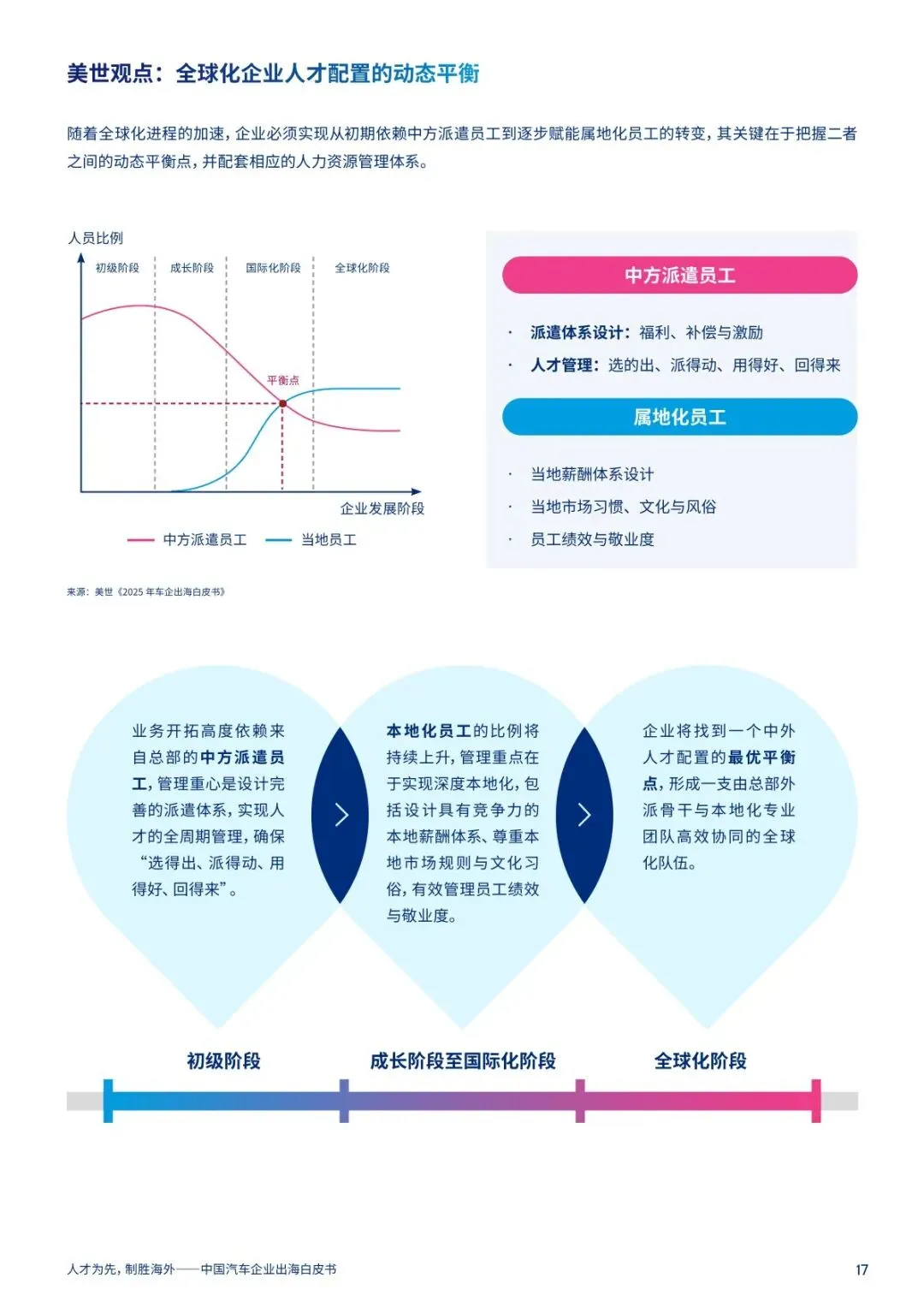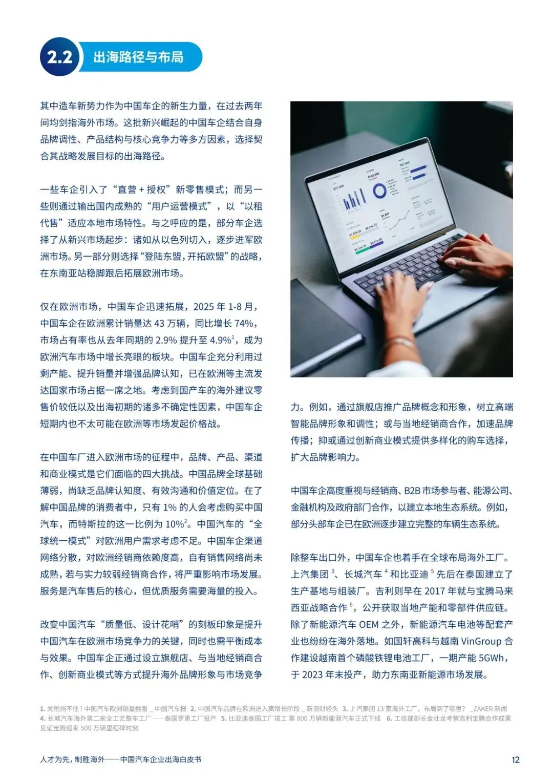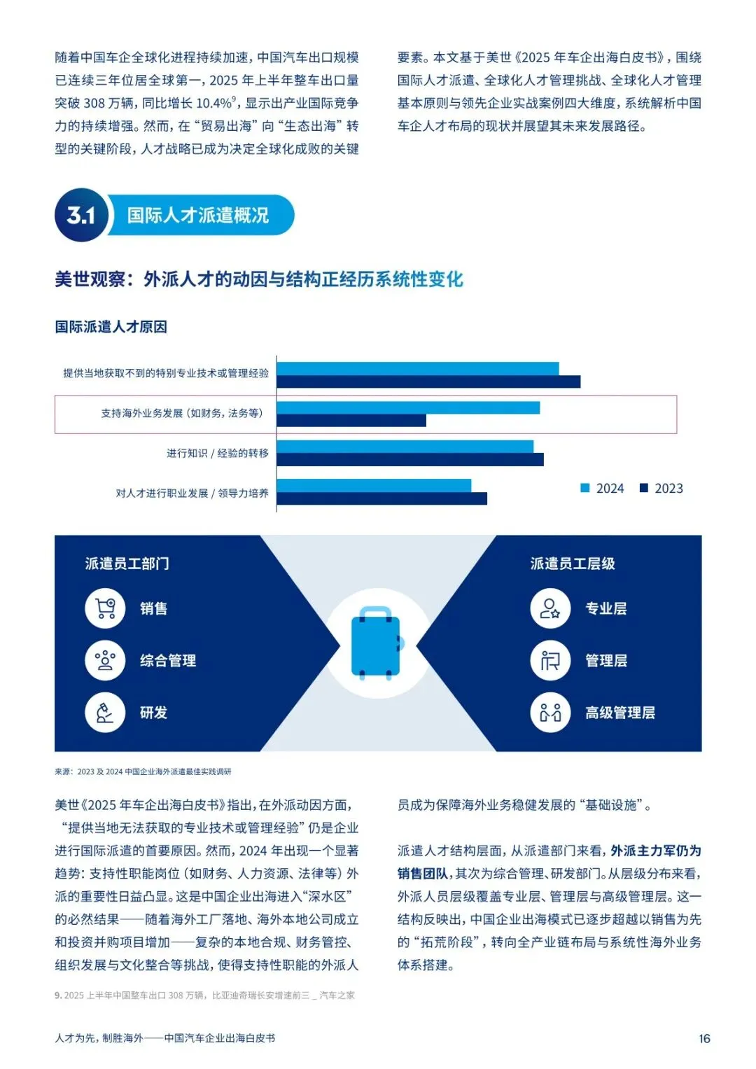 :中国已连续三年位居全球最大汽车出口国,2024 年出口 585.9 万辆,新能源汽车出口突破 100 万辆。出海路径从单纯整车出口,向本地化生产、研发与销售转型,市场布局聚焦东南亚、拉美等新兴市场,同时发力欧洲高端市场,合作模式涵盖合资建厂、技术输出等多元化形式。 - 人才管理是出海成败的关键要素