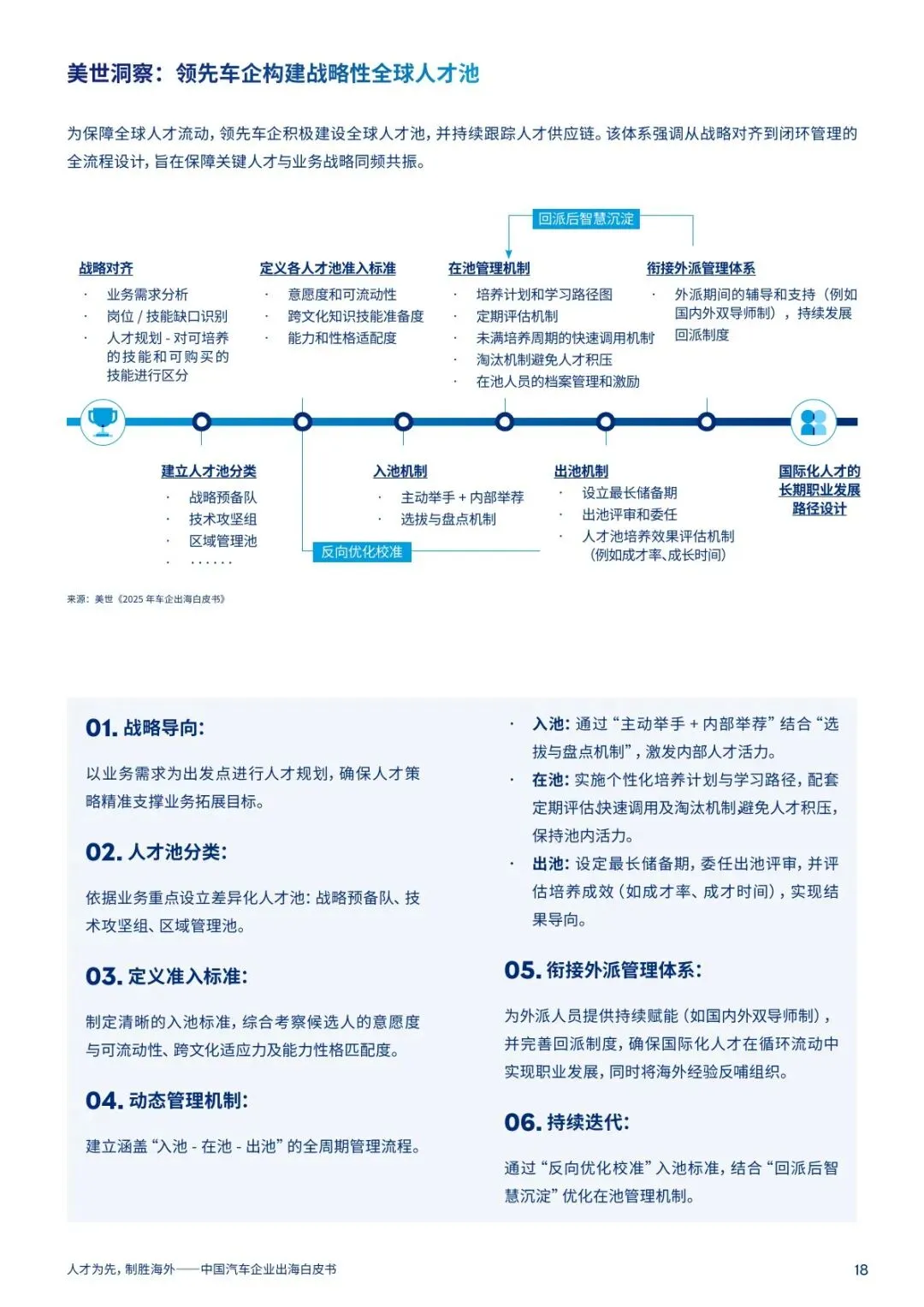 :车企出海面临人才争夺激烈、全球化管理能力不足等挑战,人才策略需与出海阶段动态匹配。领先企业通过构建全球人才池、推进人才本土化、完善外派人才全周期管理等举措,实现中外人才高效协同,案例企业通过 “生态出海” 与人才机制创新,激活全球人才活力。 - 多重风险交织考验企业风控能力